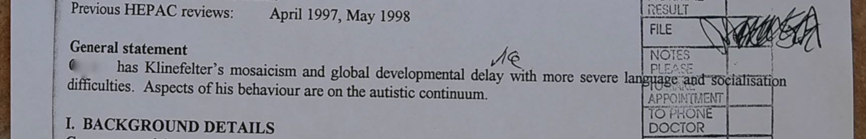 Happily* he does not appear to have fragile x, although his blood tests reveal a Klinefelter’s mosaic. I am not sure if this blood finding is an incidental finding or whether it does underlie some of his developmental abnormalities. I do, however, suspect that he may have a degree of autism. (GP, March 1997)