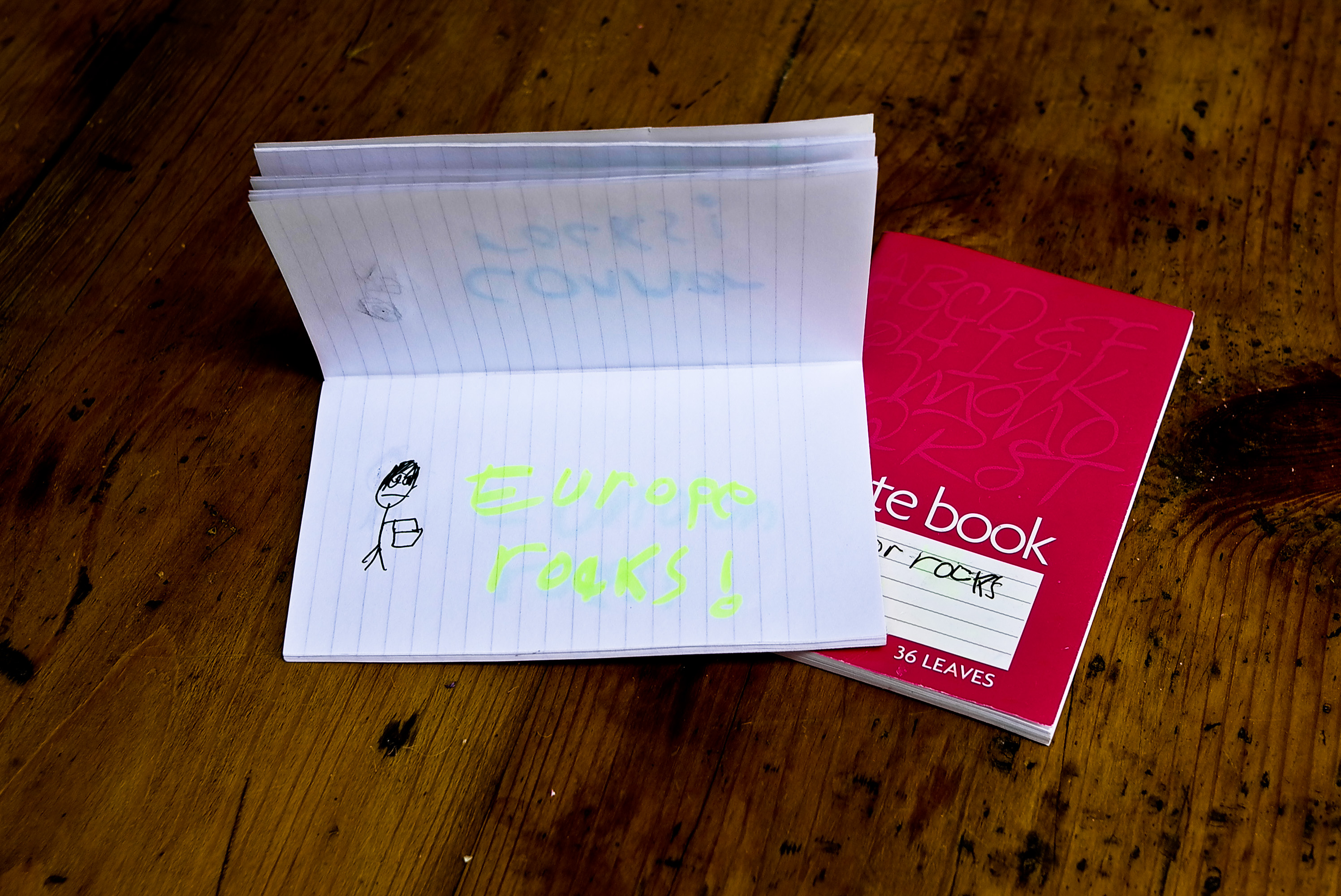 Rosie and I sorted out two bags of stuff yesterday afternoon. We found these two notebooks that made us chuckle. The ‘LB rocks’ books. On each page, he’d drawn a little figure holding something (a megaphone?) and had written what rocks in different colour neon marker pens.