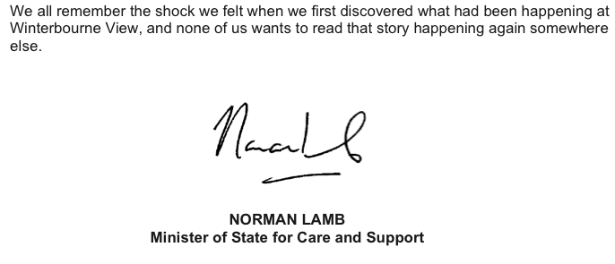 The Department of Health also published  Winterbourne View: One Year On. I’ve only glanced through this report but, other than put into place a few processes [Have ‘Winterbourne Concordat’ jokes started circulating yet? How long does it take to put a process in place…?], nothing really has happened. All talk and no action. And there’s a naive emphasis on Winterbourne View and the people who lived there. As if they’re the only people who experienced abuse in this setting.