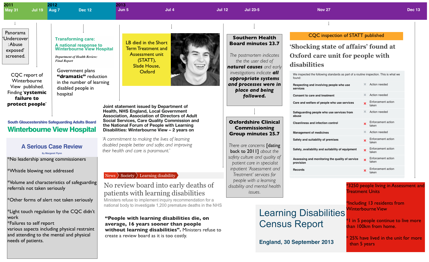 I’ve revised the (now snapshot) Timeline of Shame. Only a couple of weeks after I posted the original. It needs to be viewed in full screen. And needs to be viewed really.  To put things in context. The aim of this is to illustrate how this isn’t just about what happened to the 48 people who were patients at Winterbourne View. And it isn’t just about LB. It’s about how learning disabled people are treated like shite in this country. Particularly those incarcerated in these holding pens of hell. [Thanks to Sam Sly, Rich Watts, Jo Pyrah and Chris Hatton* for reminding me of the broader context; Ely Hospital 1967, Longacre 1994, Budock 2006… known about cases.]