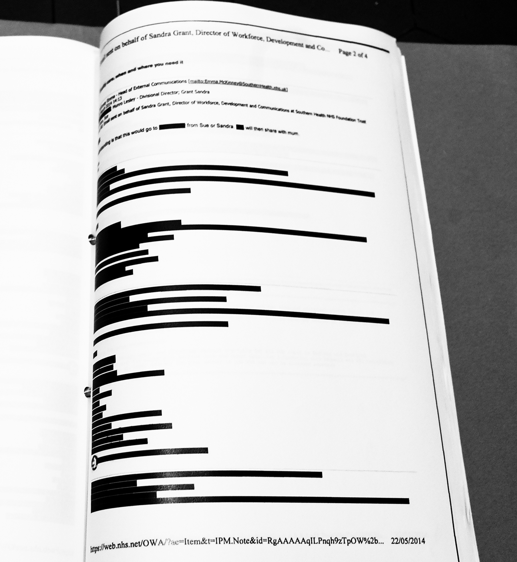 Most text has been redacted to the point of almost (not) hilarity (see above). This ‘new’ documentation is from a strangely narrow band, March – May 2014. And only people with names beginning with ‘S’ seem to avoid redaction; Sue, Sandra and me (aka ‘mum’). Well done Sue and Sandra for stepping up. Katrina Percy is only listed once. Probably by accident.