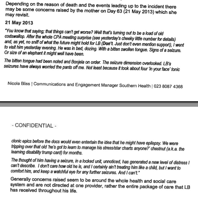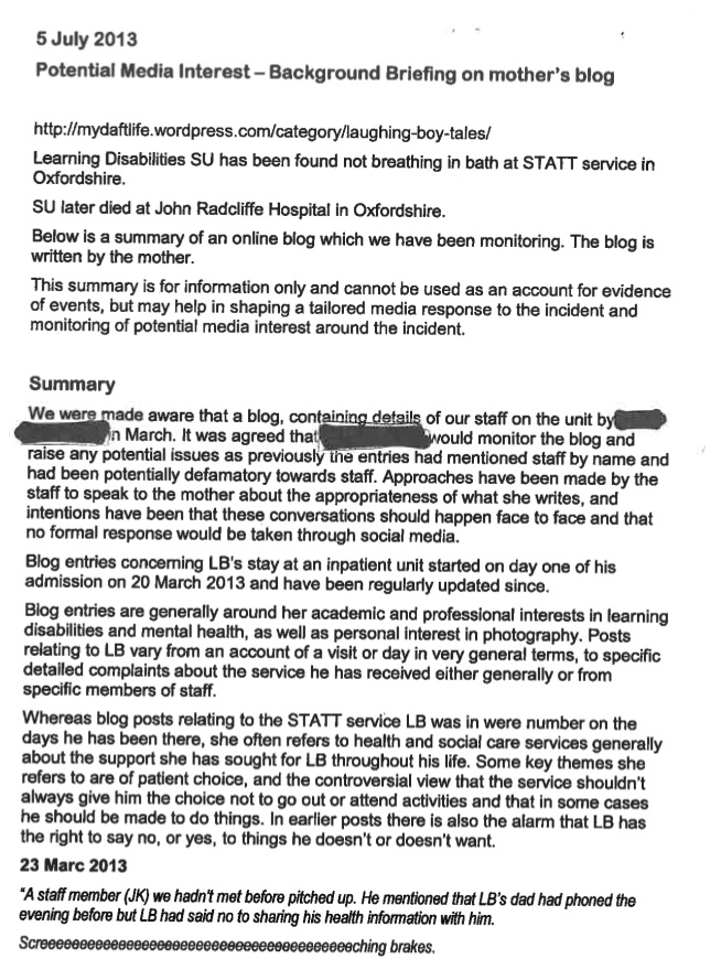 Just when you think you’ve waded through the worst of the shite, another FOI request pings in. [From the CCG, not from Sloven]. This one includes the Background Briefing on mother’s blog.  Written the day after the day after LB died. And yet they have not 16 months on disciplined staff.