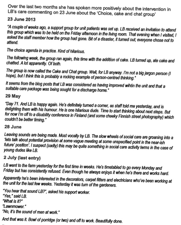 • Hi, I had a call at work one day from a member of staff from the unit who said he wanted me to know he was reading my blog. It was an odd conversation that made me feel uncomfortable, but it wasn’t clear what the purpose of the call was really. I think it was some weeks after LB went into the unit.