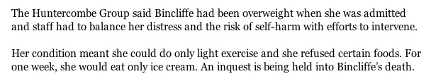 The story moves on to discuss Stephanie Bincliffe who died in an ATU (privately run by the Huntercombe Group) aged 25 and weighing almost 26 stone. Her inquest is ongoing. Why someone who died [died] and is (well should be) currently ‘news’ is mentioned after Lisa (who should have been but never was) is baffling.