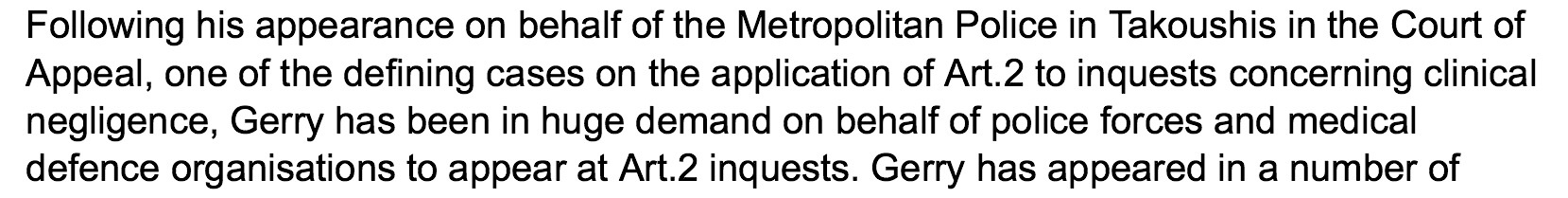 Gerry is in huge demand by the police and medical defence organisations to appear at Article 2 inquests? In huge demand?? How does this fit with your bland statement that families need no legal representation? It makes no sense at all. You must be completely distanced from the reality of the process, or worse.