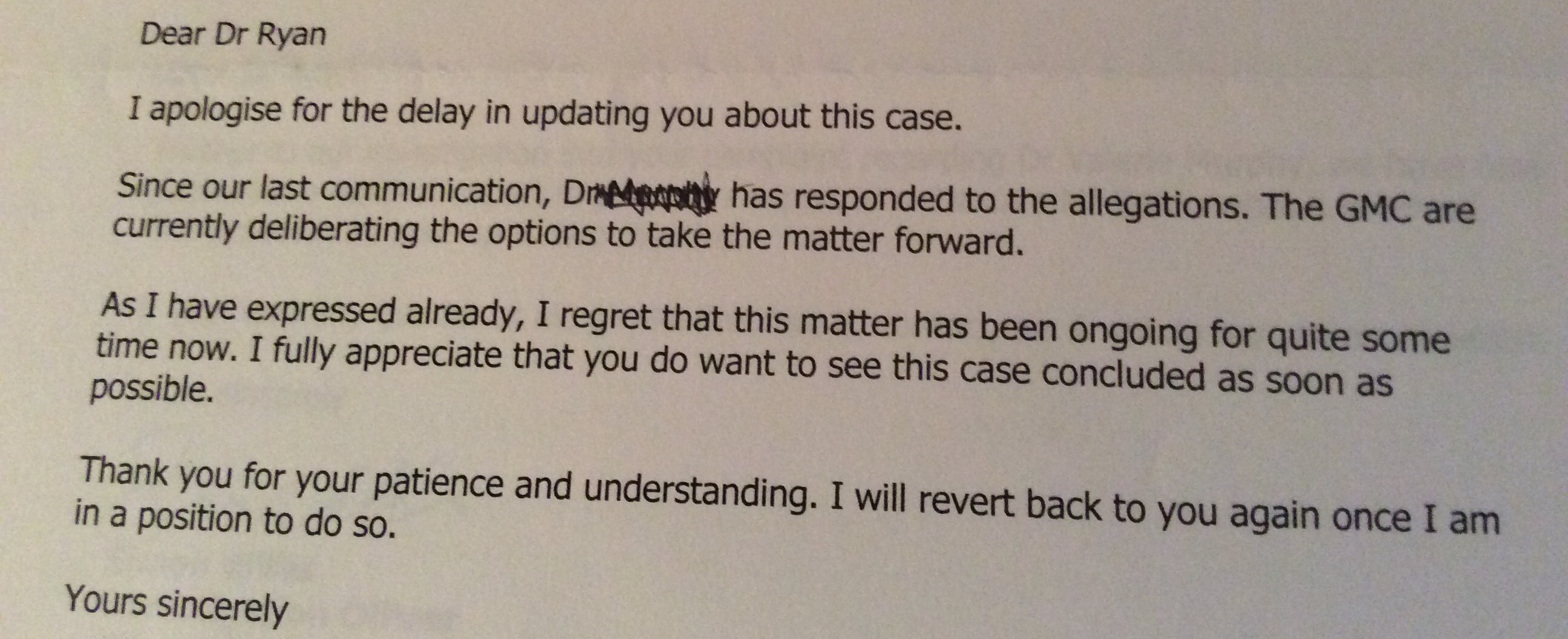 How long does it take to investigate a doctor? Good question. We referred Dr M to the General Medical Council (GMC) in May 2014. And were asked to respond promptish in a letter dated 19 June 2014.fullsizerender-7