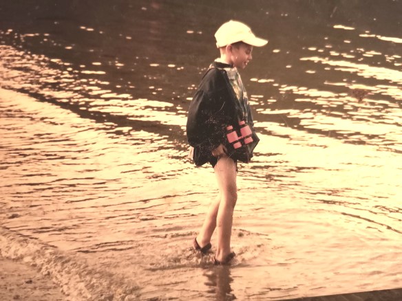Pembrokeshire. Circa. the good times. Paddling in the shallow shallows. Orange binoculars. Early Learning Centre police tabard. Baseball cap. Hoofing up your shorts. Living your best life.