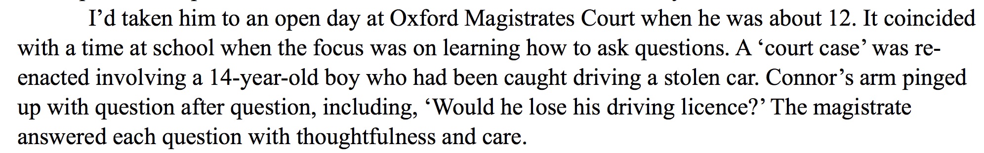 Who knows, it may even be the same magistrate. Unlikely I know, but I wonder if he’d remember the young boy who was bursting with excitement and enthusiasm that Saturday morning. Beyond thrilled with the tour of the court, the cells and the car park where the G4 vans park. A young boy who listened to and took the mocked up case so seriously, demonstrating an unwavering commitment to the process of the British justice system.