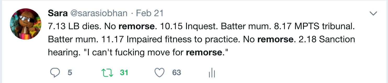 This fifteen page judgement is an excoriating and devastating read. The coroner’s meticulous engagement with the evidence (which included witness statements and spoken evidence, hospital and GP medical records going back two years before Myles died, four expert witness reports and the recordings of earlier parts of the inquest) is clear. The judgement reads like an intensely plotted narrative with every word underpinned by evidence sources, the workings out carefully documented. It ends with an unexpected and beautifully sharp twist.