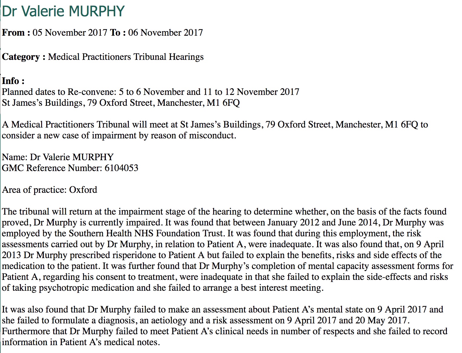 The General Medical Council (GMC) tribunal examining Valerie Murphy’s fitness to practice starts again tomorrow. Monday. And next weekend. Next Saturday and Sunday. And two more days possibly still to schedule. The findings so far are summarised here: