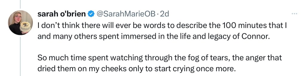 Reminded Connor’s inquest finished 10 years ago tomorrow. I gave evidence yesterday in 2015. I rarely, can barely, bear to think back to those days. Even writing this first sentence fills me with an overwhelming sense of dread. Eased in part by remembering the unwavering support we received from so many people. Family, friends, friends of friends, colleagues, and countless others. The courtroom was full daily with people who cared. Who recognised Connor mattered. He matters.