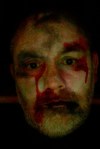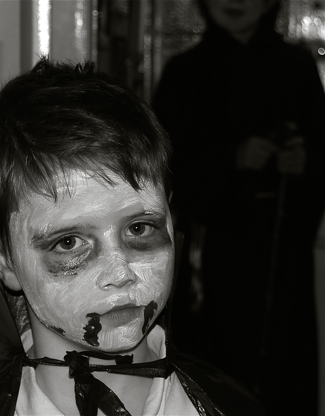 I got off the bus at midnight last night and saw someone walking jerkily along the road towards me. It was zombie Richy. Wearing a ripped jacket covered in blood and mud. Very authentic face paint and fangs.