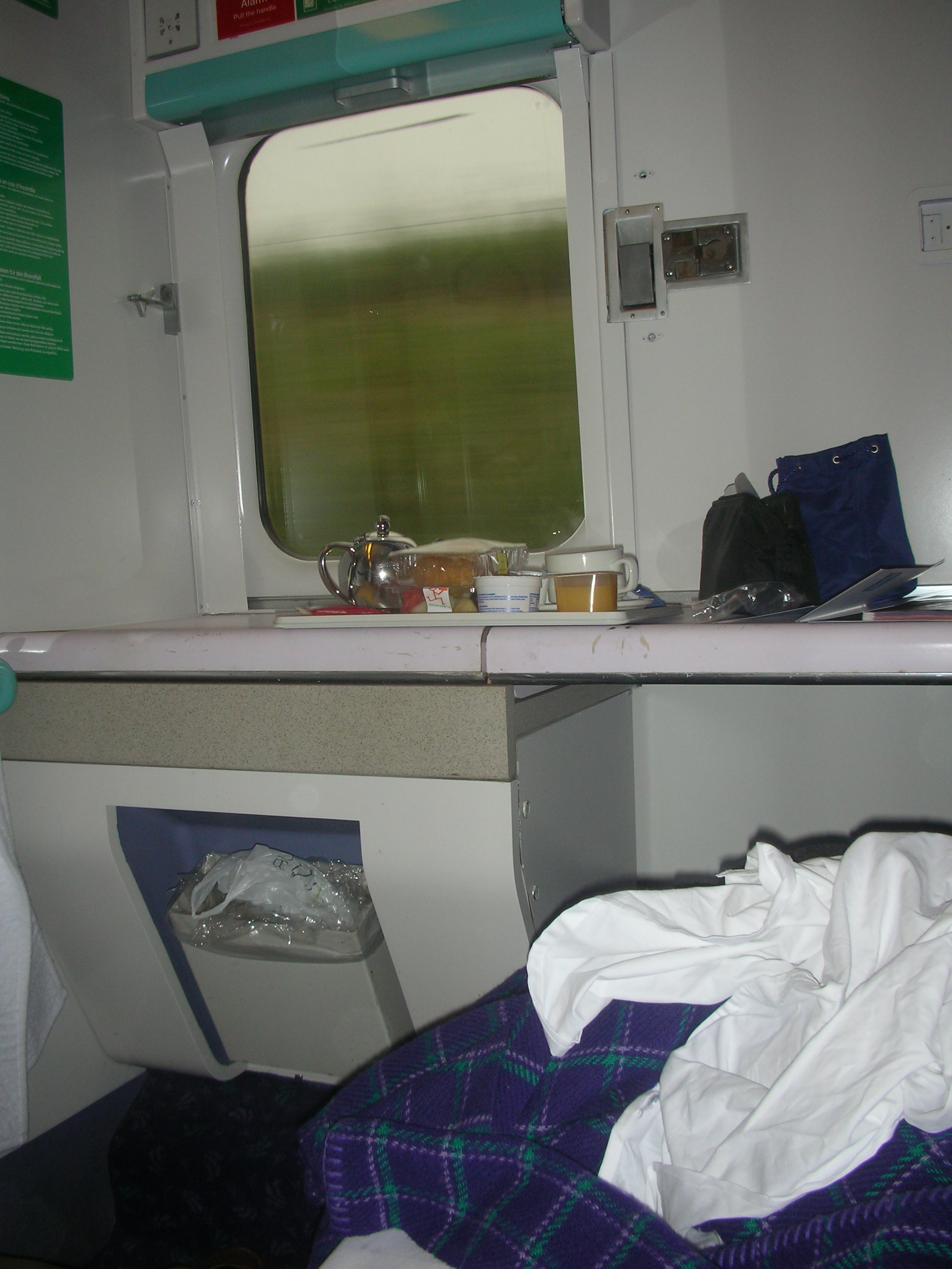 So, first the cross country sleeper, London to Aberdeen. Fun, though odd, waking at midnight and opening the blind to find we were at Crewe station. Bit of a surreal bed/private/platform/public situ. Plus there are no cabin keys; you’re supposed to call the steward to re-open your door. I didn’t want to bother Stew so did a quick loo dash leaving my door wedged open, hoping some thieving bastard didn’t filch my stuff.