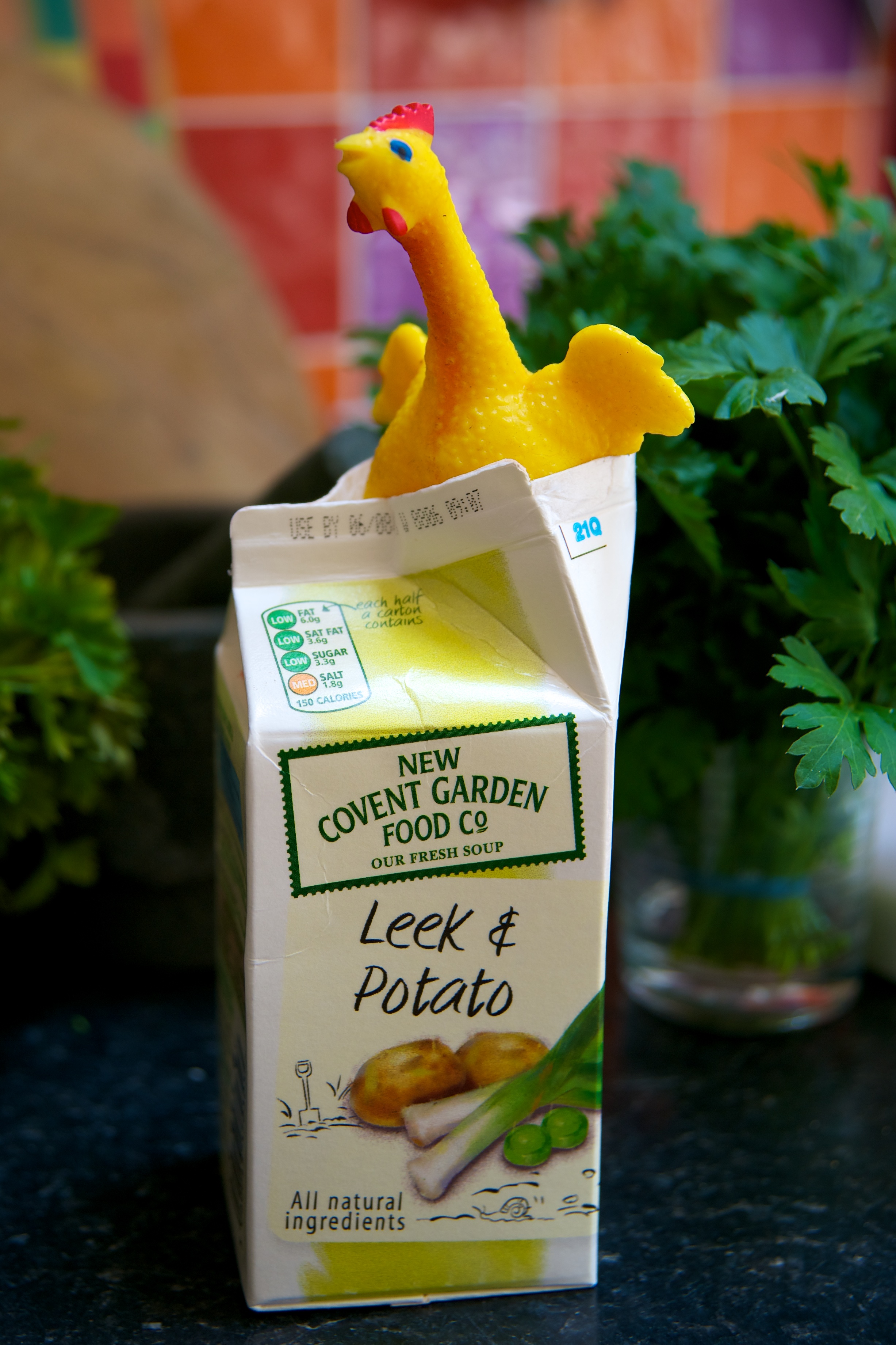 I got to the bottom of a tasty bowl of Covent Garden leek and potato soup when I saw what looked suspiciously like a bit of chicken. “EEEEEK!” I shrieked, “I’ve got a bit of chicken in my soup, Richy Rich!” “Uh? That’s outrageous”, replied Richy. Given that I ain’t knowingly* eaten meat for over 20 years, I thought that was a bit of an understatement. A lot more tasty swears came into my mind, but given that this blog has a more than healthy smattering of swearsies, I won’t include them here.